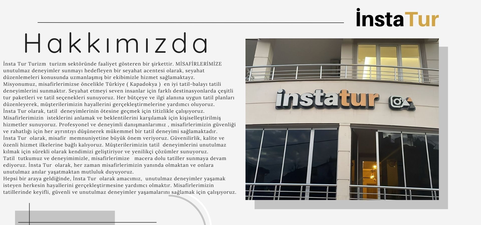 InstaTur, turizm sektöründe faaliyet gösteren bir şirkettir. Misafirlerimize unutulmaz deneyimler sunmayı hedefleyen bir seyahat acentesi olarak, seyahat düzenlemeleri konusunda uzmanlaşmış ekibimizle hizmet sağlamaktayız.